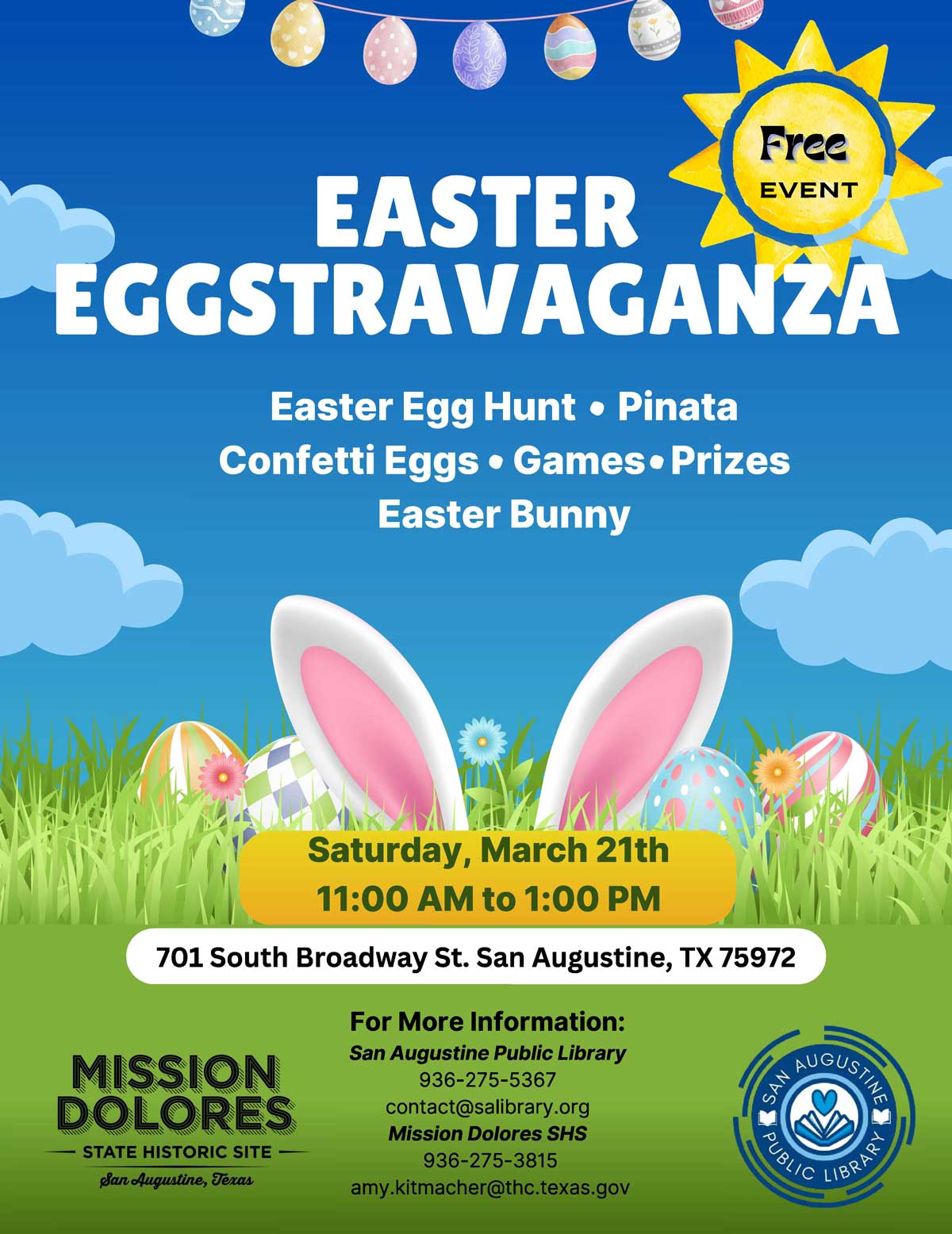 This event is hosted at Mission Dolores State Historic Site in partnership with the San Augustine Public Library, making it a perfect outing for families looking for Easter activities in East Texas.