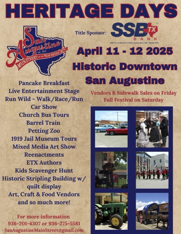 For more information call 936-201-4307 or 936-275-5581.  Or email to sanaugustinemainstreet@gmail.com