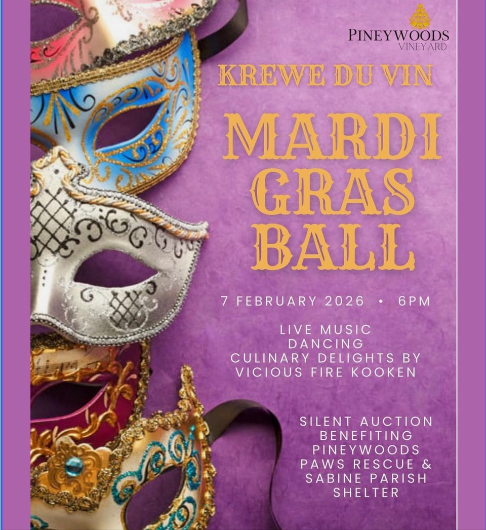 Join us for a festive Mardi Gras Ball on February 7, benefiting the newly established Pineywoods Paws Animal Rescue, a 501(c)(3) organization serving San Augustine and Sabine Counties. Doors open at 6:00 PM, and the evening promises great food, fun, and a meaningful cause.